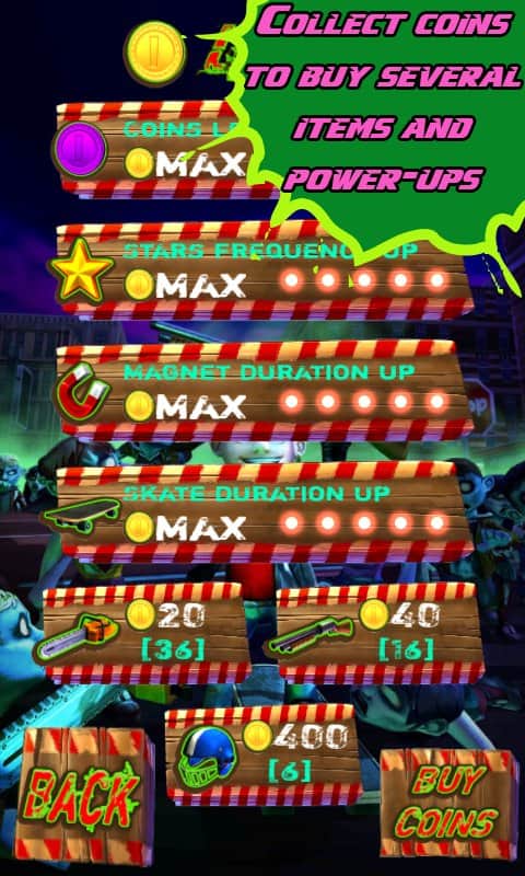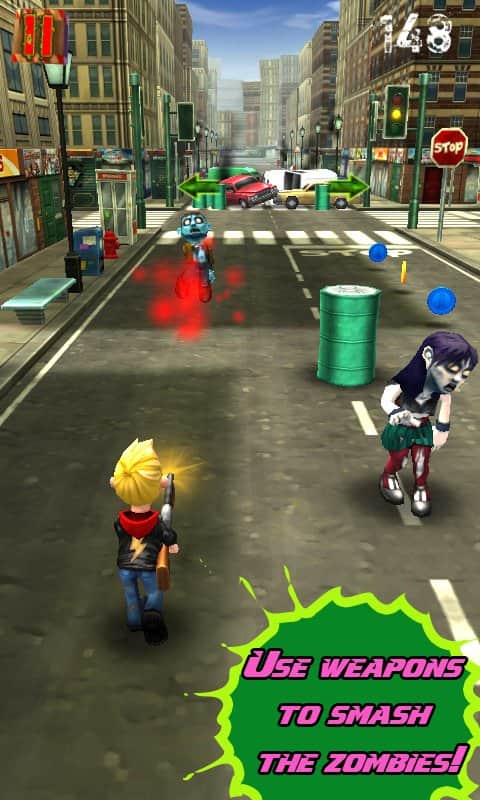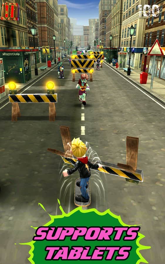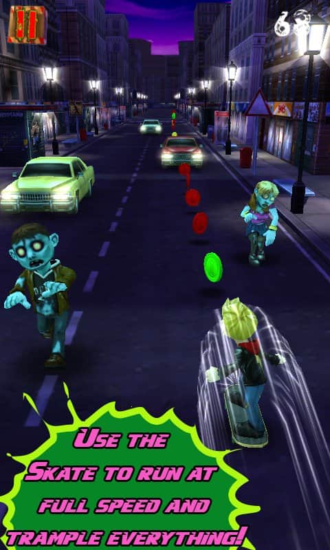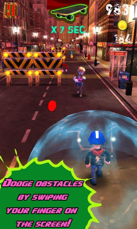 Zombies After Me! - Ваш город захвачен голодными зомби и ваша единственная цель- не быть съеденными этими мерзкими монстрами. Пройдите свой путь через множеством ходячих мертвецов с бензопилой и дробовиком. Используйте скейтборд и ваши акробатические навыки, чтобы пройти все препятствия и обойти взрывоопасные бочки, разбросанные по всей территории, по которой вам придется пройти. Собирайте монеты, для того, чтобы купить несколько нужных предметов и получить бонусы в виртуальном магазине.