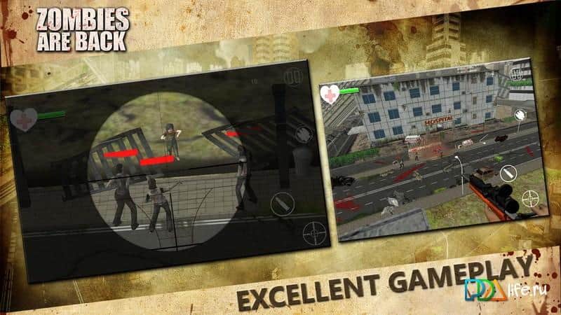 Zombies Are Back - земля через несколько месяцев после зомби-апокалипсиса, в живых осталось очень мало людей. Вирус разошелся по всей планете и нанес непоправимый урон. И теперь вам предстоит взять в руки снайперскую винтовку и начать убивать всех зомби, попавших вам на прицел. Убивайте зомби и спасайте выживших людей от них, а также выполняйте различные миссии и получайте за это награды.