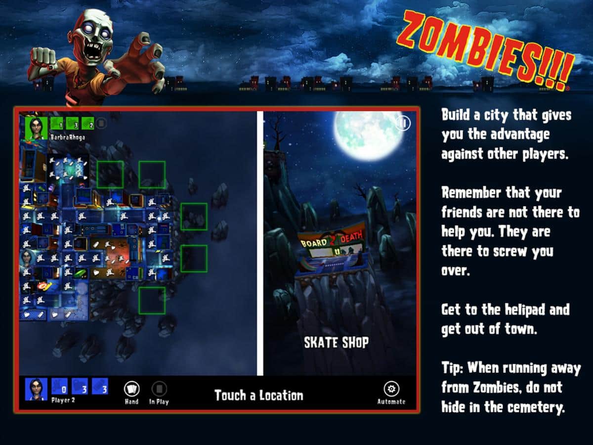 Zombies !!! Board Game – увлекательная настольная игра, в которой вам предстоит управлять героем в городе полном зомби. Наш герой хочет покинуть этот ужасный город, где бушует ужасный вирус, превращающий людей в зомби. Он видит вертолёт и хочет попасть на него, но пилот опасается садиться и предлагает герою пройти на вертолётную площадку, где его будет ждать спасение. Продумывайте каждый свой шаг и действуйте как можно быстрее, чтобы добраться до вертолетной площадки быстрее всех. Игра позволяет играть до четырем игрокам одновременно или проверить свои способности играя против Al. Выбирайте себе персонажа из десяти представленных в игре, каждый из которых обладает уникальными навыками и способностями.