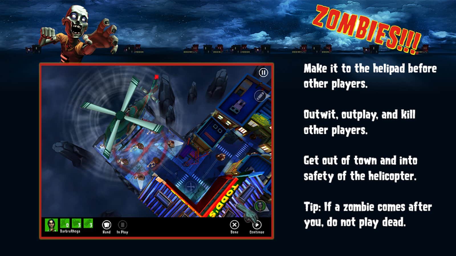 Zombies!!! – настольная игра с элементами головоломки на андроид, где вам предстоит найти себе дорогу и избежать встречи с зомби. В этой игре вы окажитесь в городе, где повсюду кишат голодные зомби, вашей задачей будет быстрее других игроков добраться до вертолетной площадки и сбежать с этого злополучного города. Сложность игры заключается в том, что зомби будут преследовать вас и подстерегать под каждым углом, будьте бдительны и осторожны, прокладывая себе дорогу к выходу. Станьте хитрее ваших соперников и опережайте их на шаг или два вперед. Найдите выход из города первым, опередив соперников.