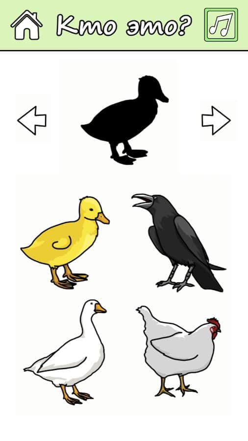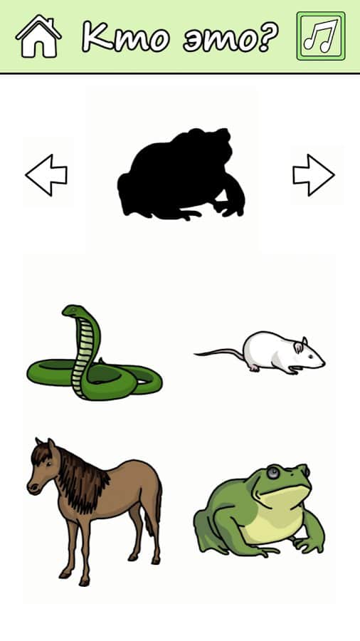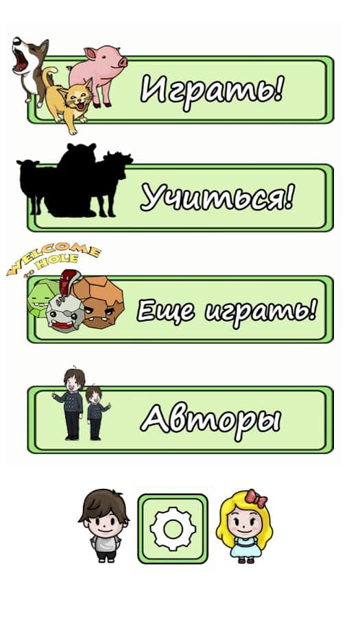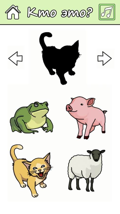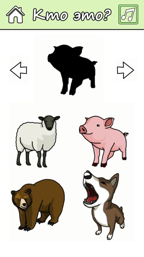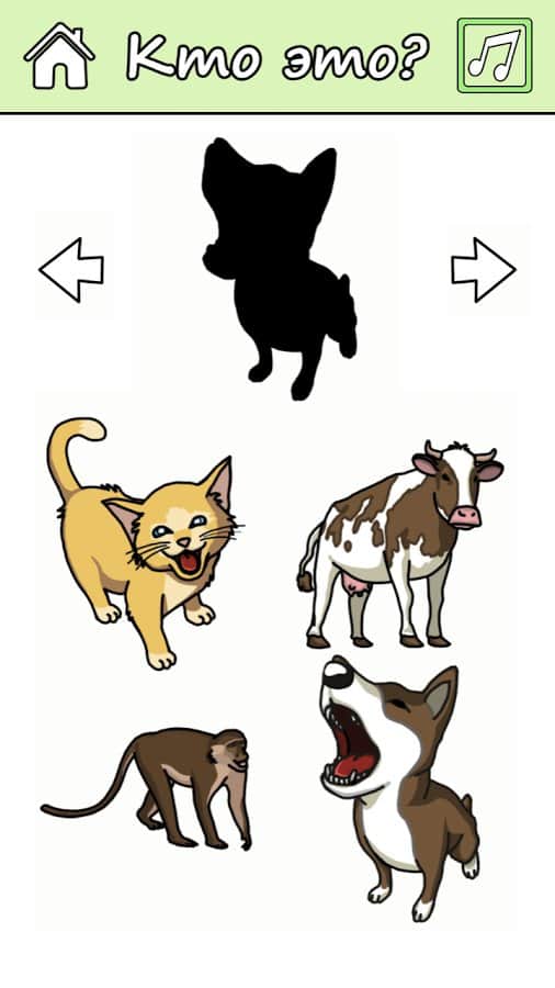 Второй режим «Учиться» в этом режиме ваш ребенок не будет видеть животное, а только его силуэт и ему необходимо отгадать его название и звук из четырех вариантов предложенных в игре. Также чтобы повторить голос диктора, который задает вопрос, нажмите на специальную кнопку.